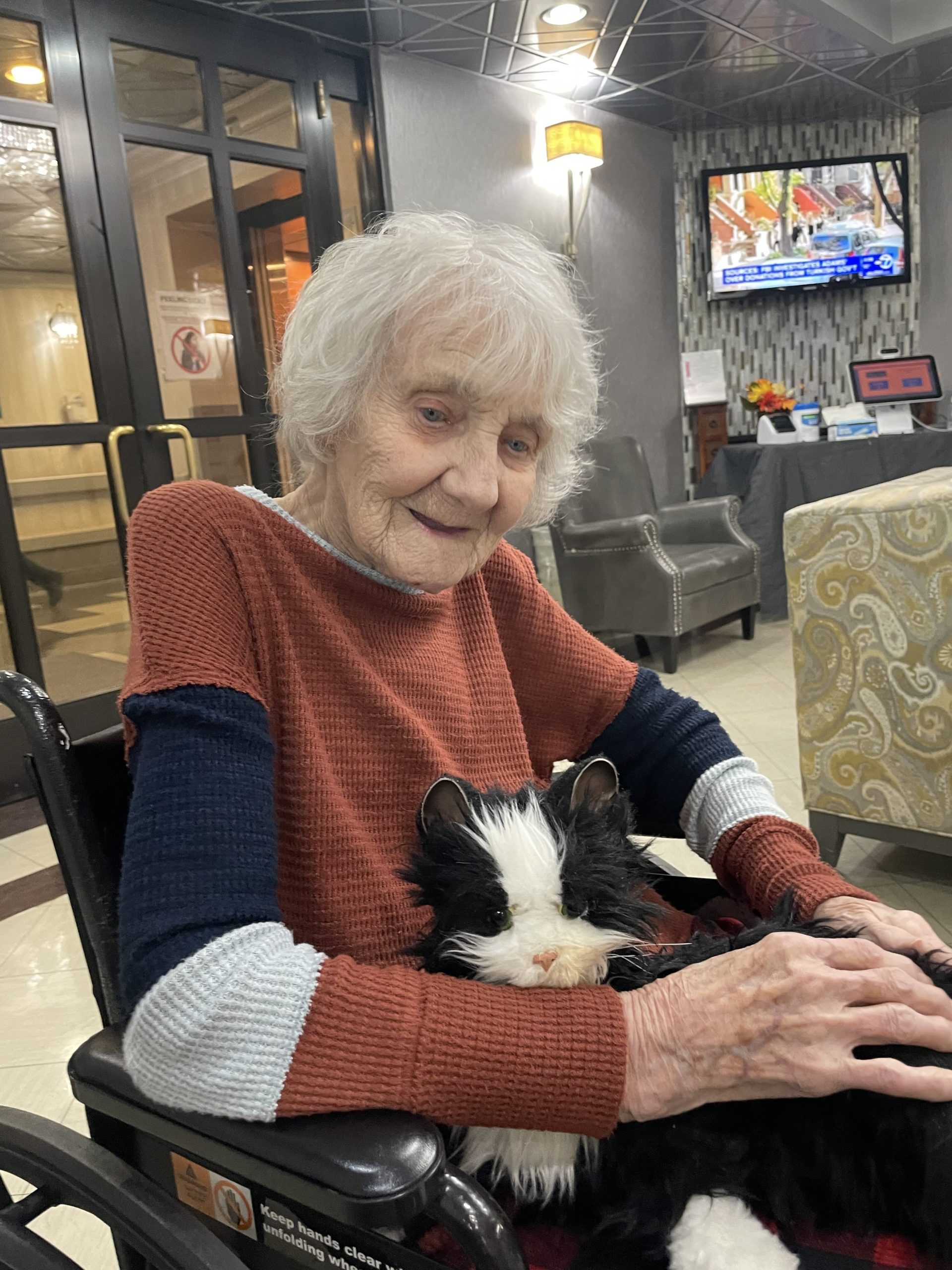 “My mom was diagnosed with dementia in 2022. She had been showing signs long before that but when I finally realized what was going on, the dementia had advanced into a late stage and she needed extra help. Just before learning of her diagnosis I got her a black cat for which she named Dallas (Yes, she’s a cowboy fan). Unfortunately, she couldn’t take her cat with her.  While visiting facilities, there was one facility that had companions at their nurse’s station. What a great idea! I got her the tuxedo cat because it looked like her cat. She absolutely loves it. It is her savior. I purchased a dog and 2 cats for their facility. It’s rewarding to see the relief in their eyes when they’re looking at the companions. My mom has since passed. I left her black kitty for others to enjoy and get benefits from it. This disease is awful.”